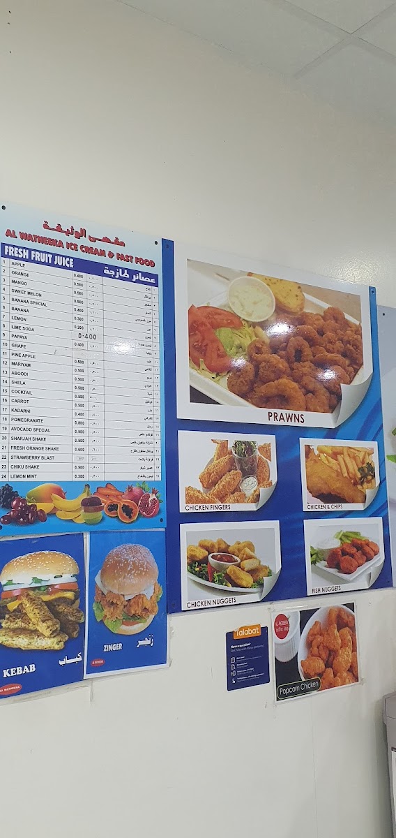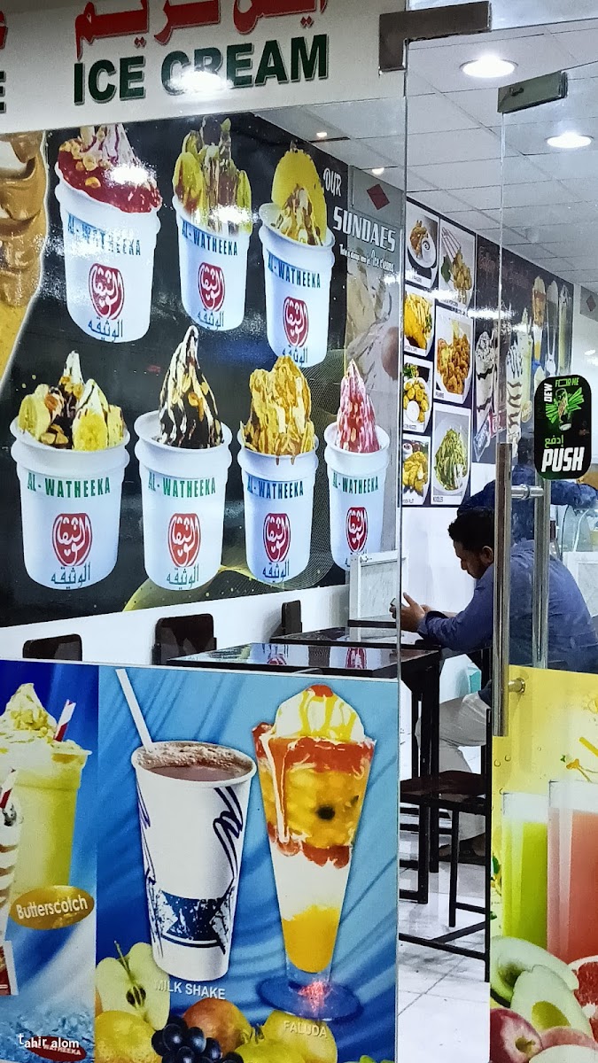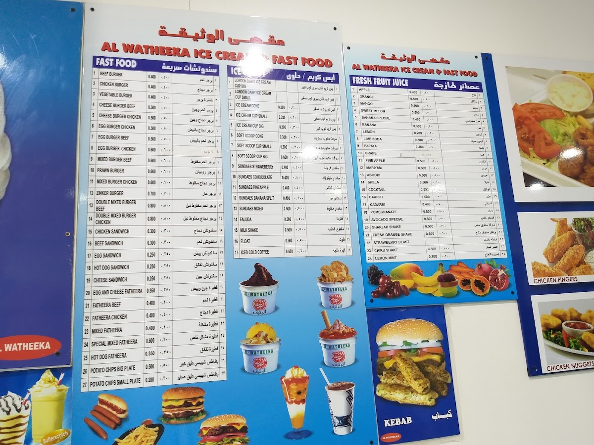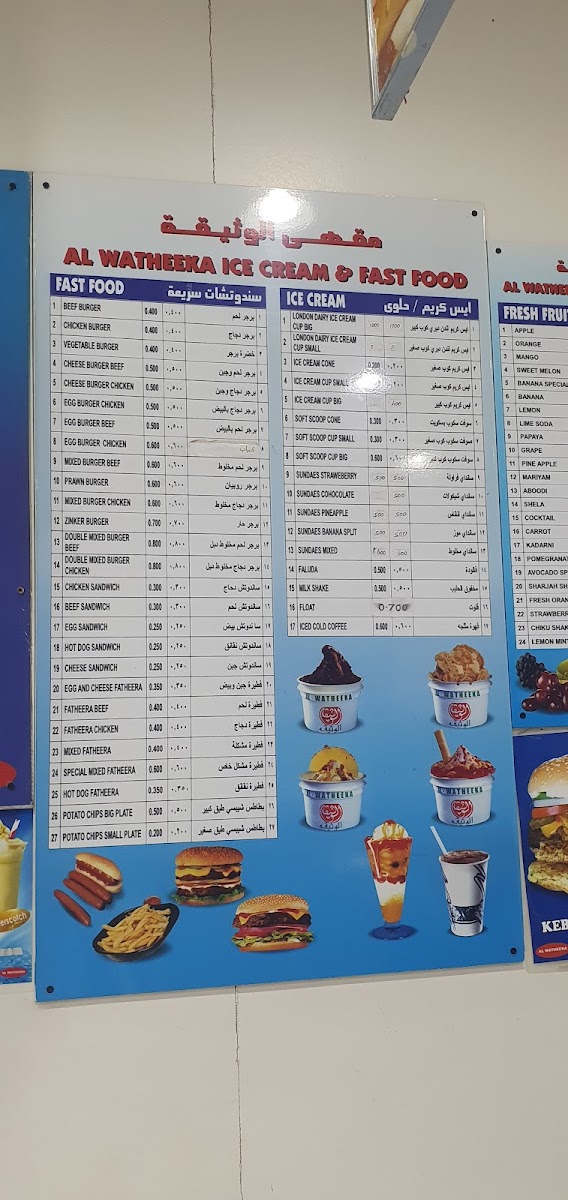 Dining at Al Watheeka Ice Cream Salalah صلالة مقهى الوثيقة offers a playful mix of flavors that cater to every craving. The burger selection is hearty, featuring options like Kebab Burger, Zinger Burger, Double Zinger Burger, and the indulgent Mix Burger, each promising a satisfying bite. For those with a sweet tooth, the milkshakes impress with Butterscotch, Strawberry, Mango, Pistachio, and Oreo Milkshake, while the juice menu creatively blends fruits in choices like Orange With Apple Juice, Mango With Avocado Juice, Grapes With Pomegranate Juice, Watermelon Juice, and Mango With Papaya Juice, alongside traditional options like Pineapple Juice, Orange Juice, Sweet Melon Juice, Maryam Juice, and Papaya Juice. The plates are comforting and generous, with Noodles Plate, Prawns Plate, Chicken Nuggets Plate, Chicken Fingers Plate, and Chicken And Chips serving as reliable staples. Ice cream enthusiasts are treated to delights such as Primer Pineapple Ice Cream, Banana Split Ice Cream, Championship Chocolate Ice Cream, Falooda, and Butterscotch Delight Ice Cream, making dessert a true highlight. Sandwiches like Chicken Feteera, Beef Feteera, Mixed Feteera, Hotdog Feteera, and Egg And Cheese Feteera offer handheld satisfaction, while the beverage selection keeps it simple with 7 Up, Pepsi, and Mountain Dew. Overall, the menu strikes a balance between classic comfort foods, inventive ice creams, and refreshing drinks, ensuring that every visit leaves a lasting taste of Salalah’s casual dining charm.